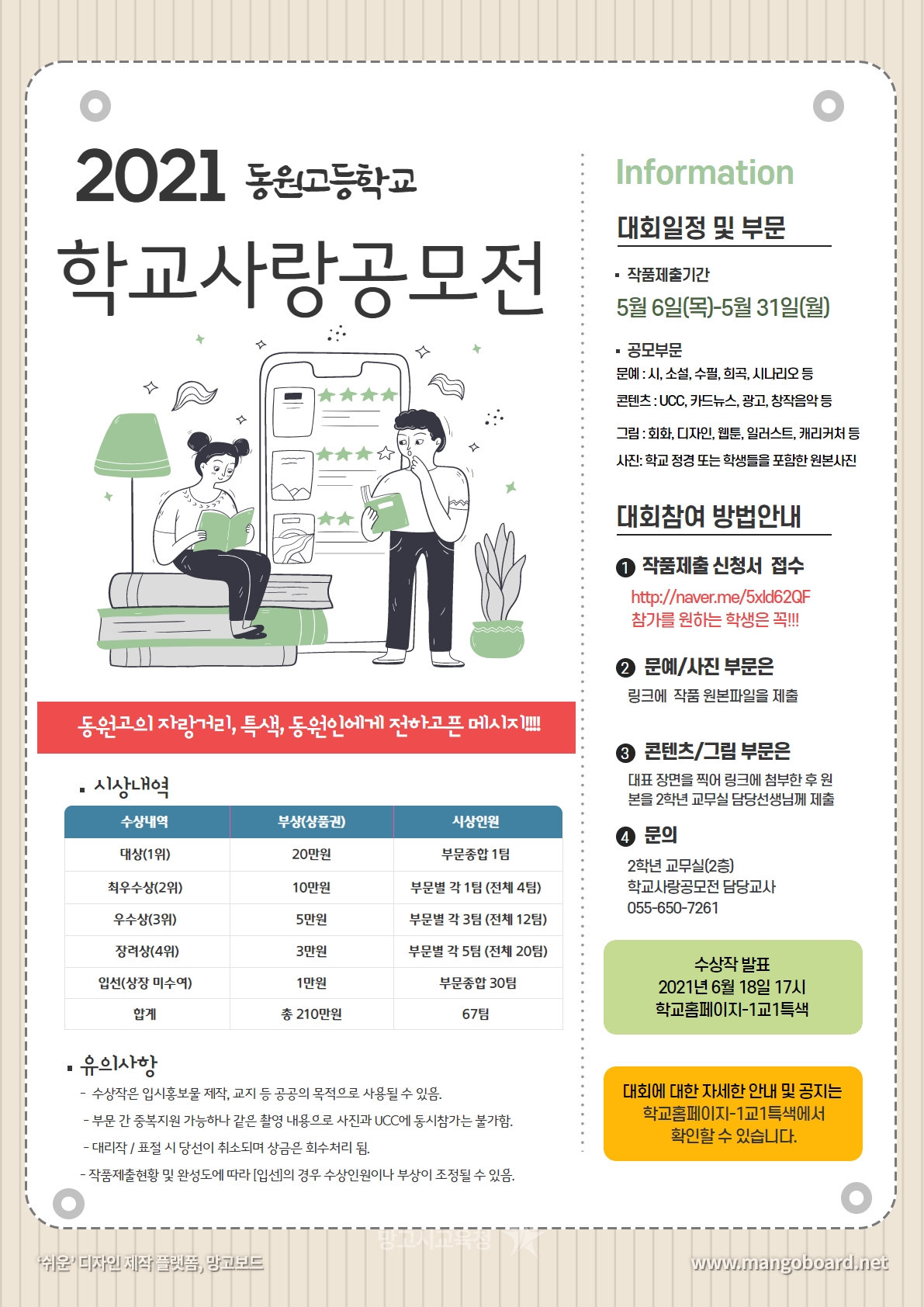 1. 공모전 일정 가. 공 고 : 2021년 5월 6일(목) 나. 제출기간 : 2021년 5월 6일(목)~5월 31일(월) 다. 응모주제 : 동원고의 특색, 우리학교 자랑거리, 동원인에게 전하고 싶은 메시지 라. 지원자격 : 동원고등학교 재학생 마. 작품제출 : 1) http://naver.me/5xld62QF작품제출신청서 작성(참가자 전원) 2) 문예, 사진 작품은 원본 파일을 위 링크에 제출 3) 콘텐츠, 그림은 대표 장면을 찍어 링크에 첨부한 후 2학년 교무실 공모전 담당교사에게 직접 제출 바. 심사기준 : 주제적합성, 주제의식의 전달력, 표현력, 완성도 사. 결과발표 : 2021년 6월 18일(금) 17시 / 학교홈페이지 --> 6월 23일 (목) 17시로 연기 아. 문 의 : 2학년 교무실 학교사랑공모전 담당교사 (650-7261) 자. 후 원 : 동원고등학교 총동창회 2. 공모전 내용 가. 공모부문 부문 | 공모내용 | 형식 | 인원제한 | 문예 | 시, 수필(일기, 수기), 희곡, 소설, 시나리오 등 | 양식 : A4 5장 이내 굴림체 11p / 줄간격 160 | 1인 | 콘텐츠 | UCC, 카드뉴스, 광고, 창작음악 등 | HD화질 / 5분이내 | 최대 4인 | 그림 | 회화, 디자인, 만화, 포스터, 일러스트, 캐리커처 등 | 자유양식 / 수기작업만 인정 | 1인 | 사진 | 학교 정경 또는 학교의 특색을 드러낼 수 있는 사진 | 1인 1장만 제출가능(앱 사용 및 편집, 포토샵 사용 시 심사대상에서 제외) | 1인 |
